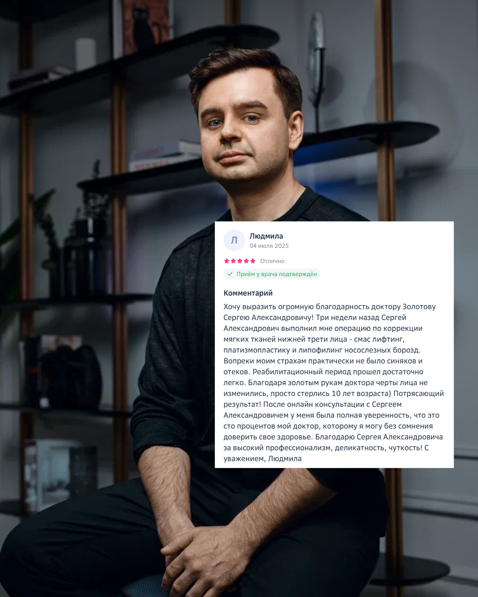 «Хочу выразить огромную благодарность доктору Золотову Сергею Александровичу! Три недели назад Сергей Александрович выполнил мне операцию по коррекции мягких тканей нижней трети лица - смас лифтинг, платизмопластику и липофилинг носослезных борозд. Вопреки моим страхам практически не было синяков и отеков. Реабилитационный период прошел достаточно легко. Благодаря золотым рукам доктора черты лица не изменились, просто стерлись 10 лет возраста) Потрясающий результат! После онлайн консультации с Сергеем Александровичем у меня была полная уверенность, что это сто процентов мой доктор, которому я могу без сомнения доверить свое здоровье. Благодарю Сергея Александровича за высокий профессионализм, деликатность, чуткость! С уважением, Людмила»