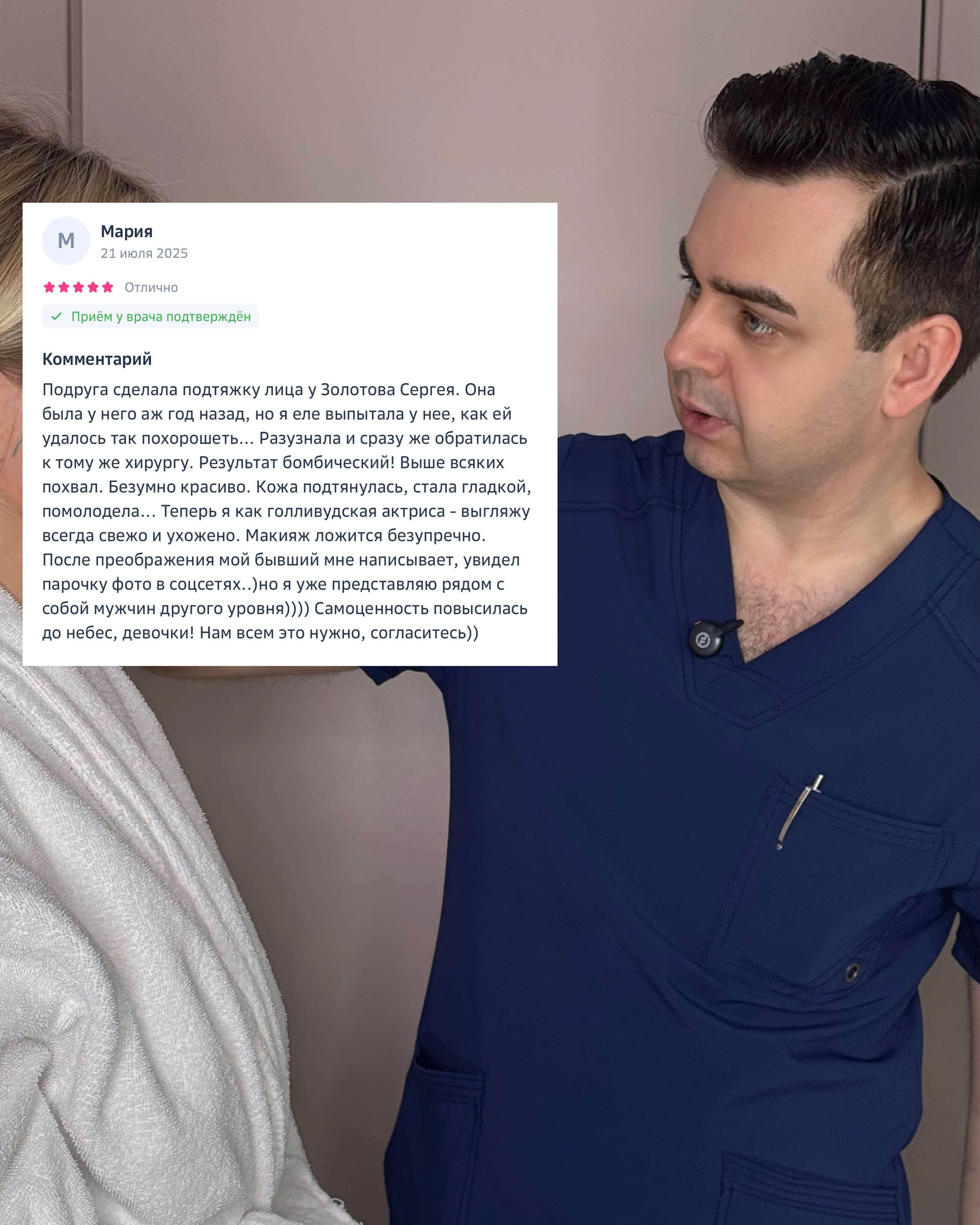 «Подруга сделала подтяжку лица у Золотова Сергея. Она была у него аж год назад, но я еле выпытала у нее, как ей удалось так похорошеть... Разузнала и сразу же обратилась к тому же хирургу. Результат бомбический! Выше всяких похвал. Безумно красиво. Кожа подтянулась, стала гладкой, помолодела... Теперь я как голливудская актриса - выгляжу всегда свежо и ухожено. Макияж ложится безупречно. После преображения мой бывший мне написывает, увидел парочку фото в соцсетях..)но я уже представляю рядом с собой мужчин другого уровня)))) Самоценность повысилась до небес, девочки! Нам всем это нужно, согласитесь))»