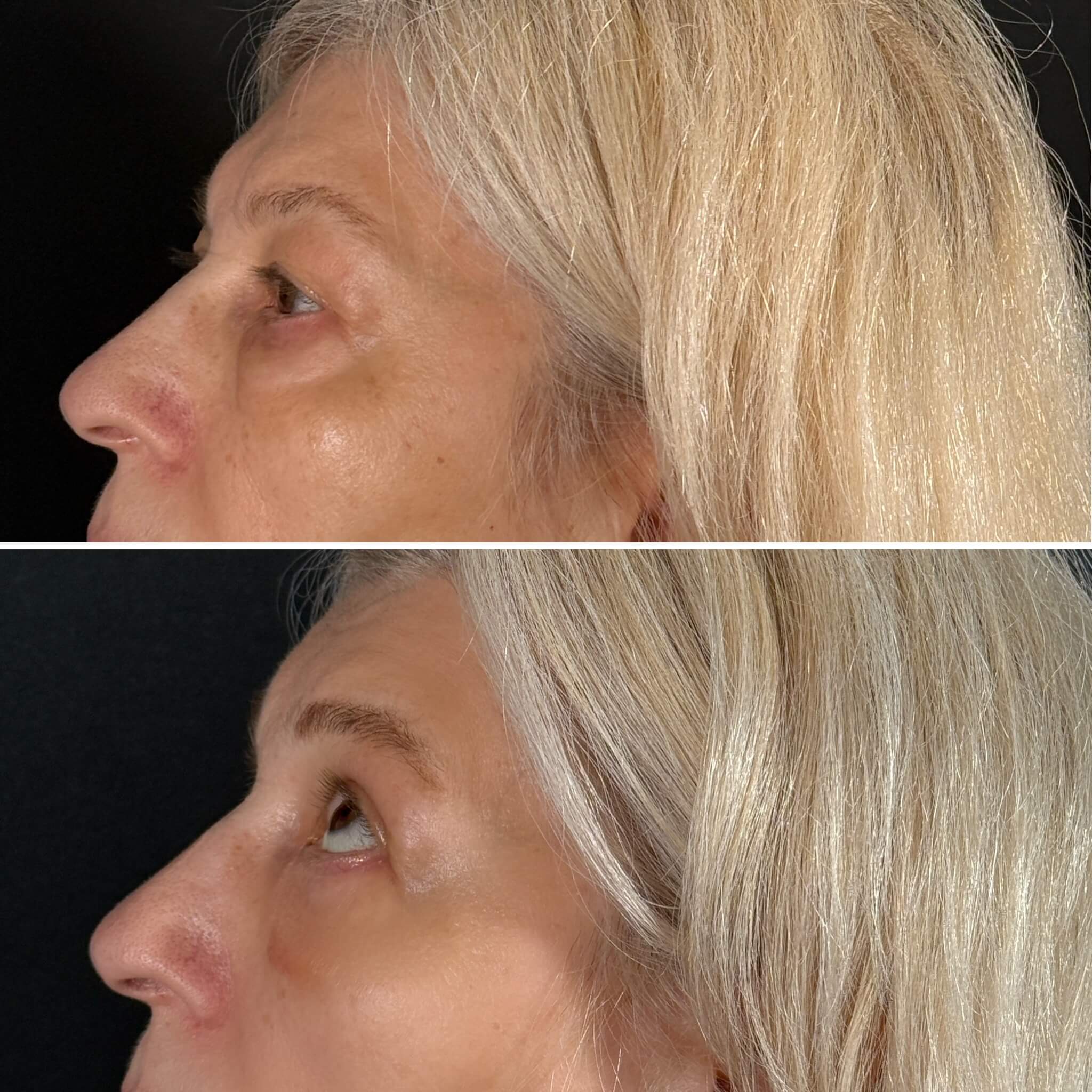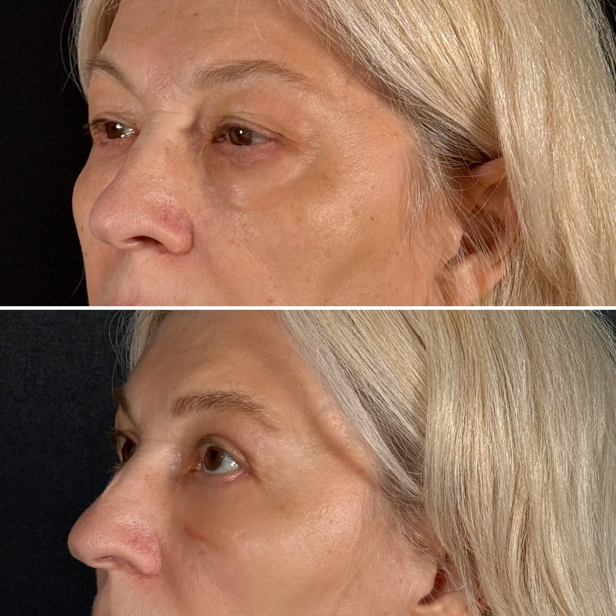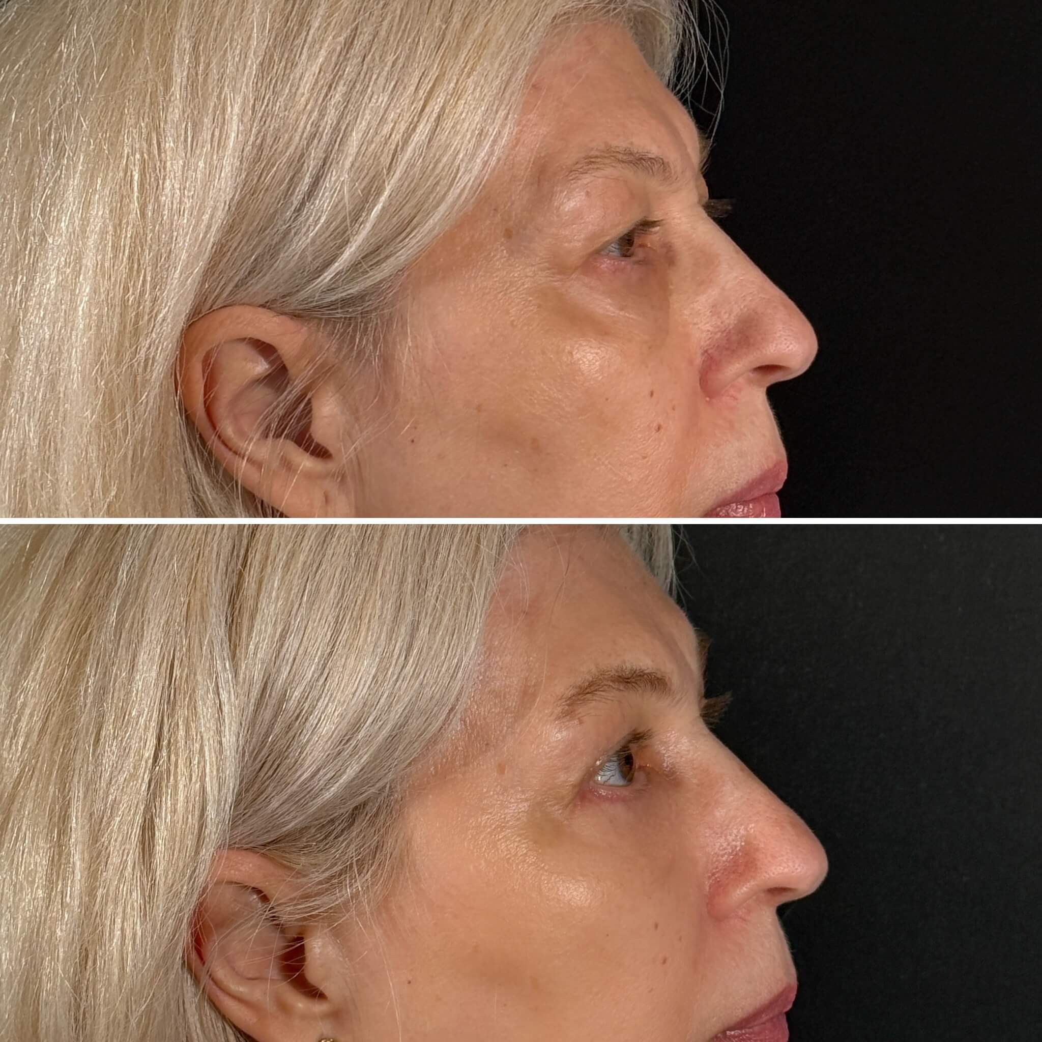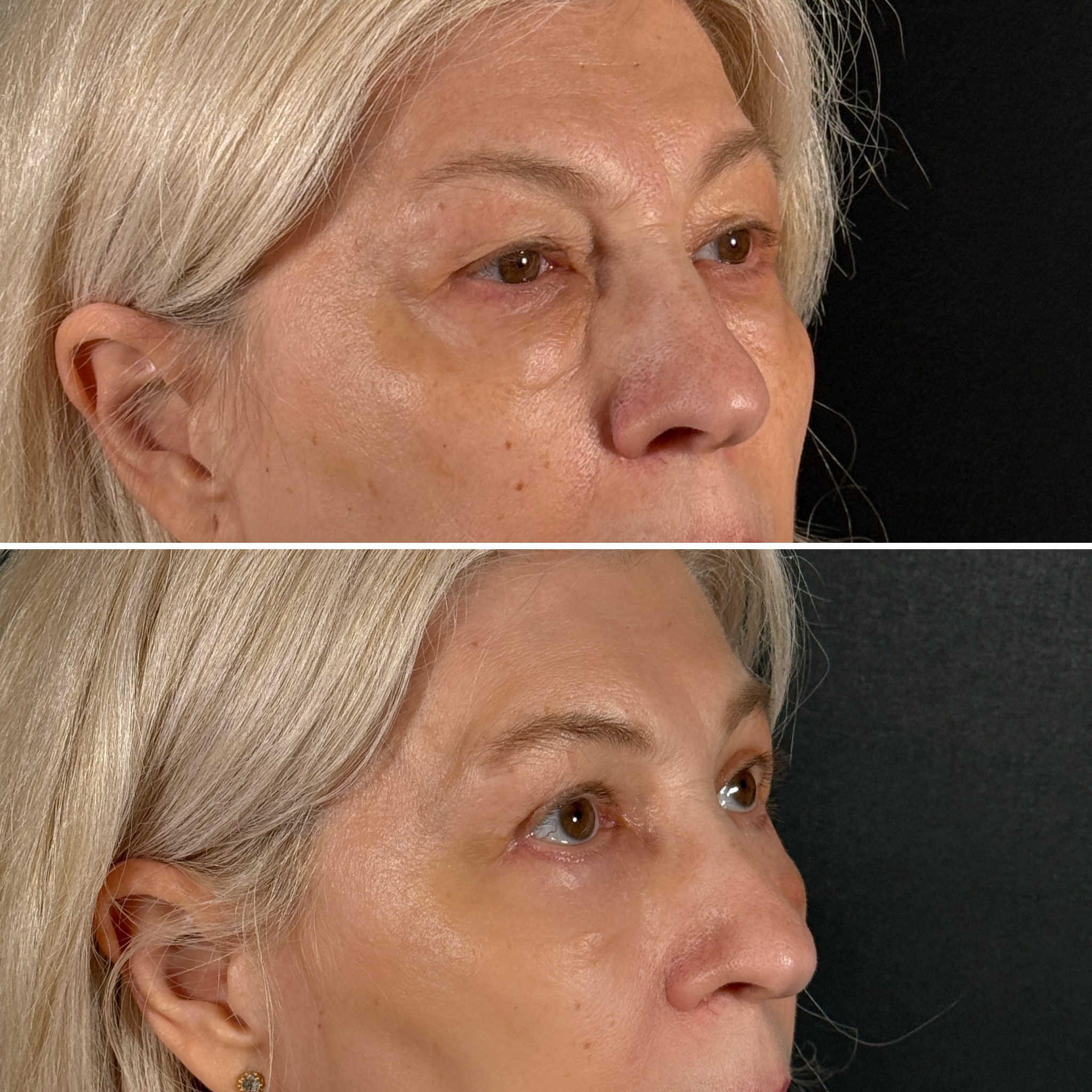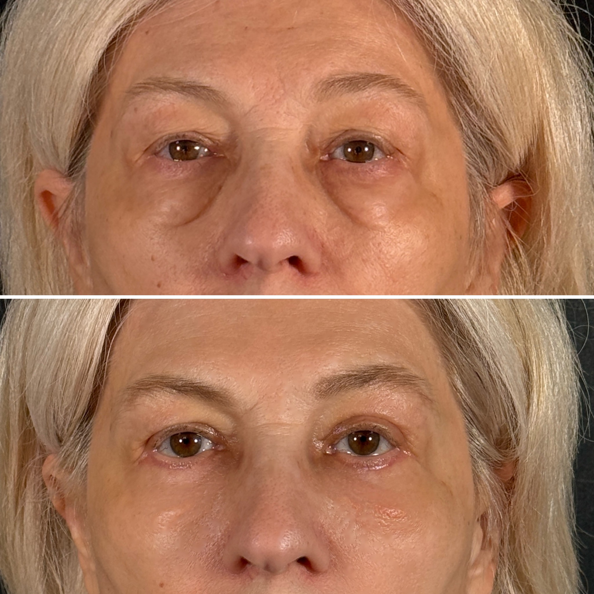 Выполнена блефаропластика верхних и нижних век, липофилинг носослезных борозд.