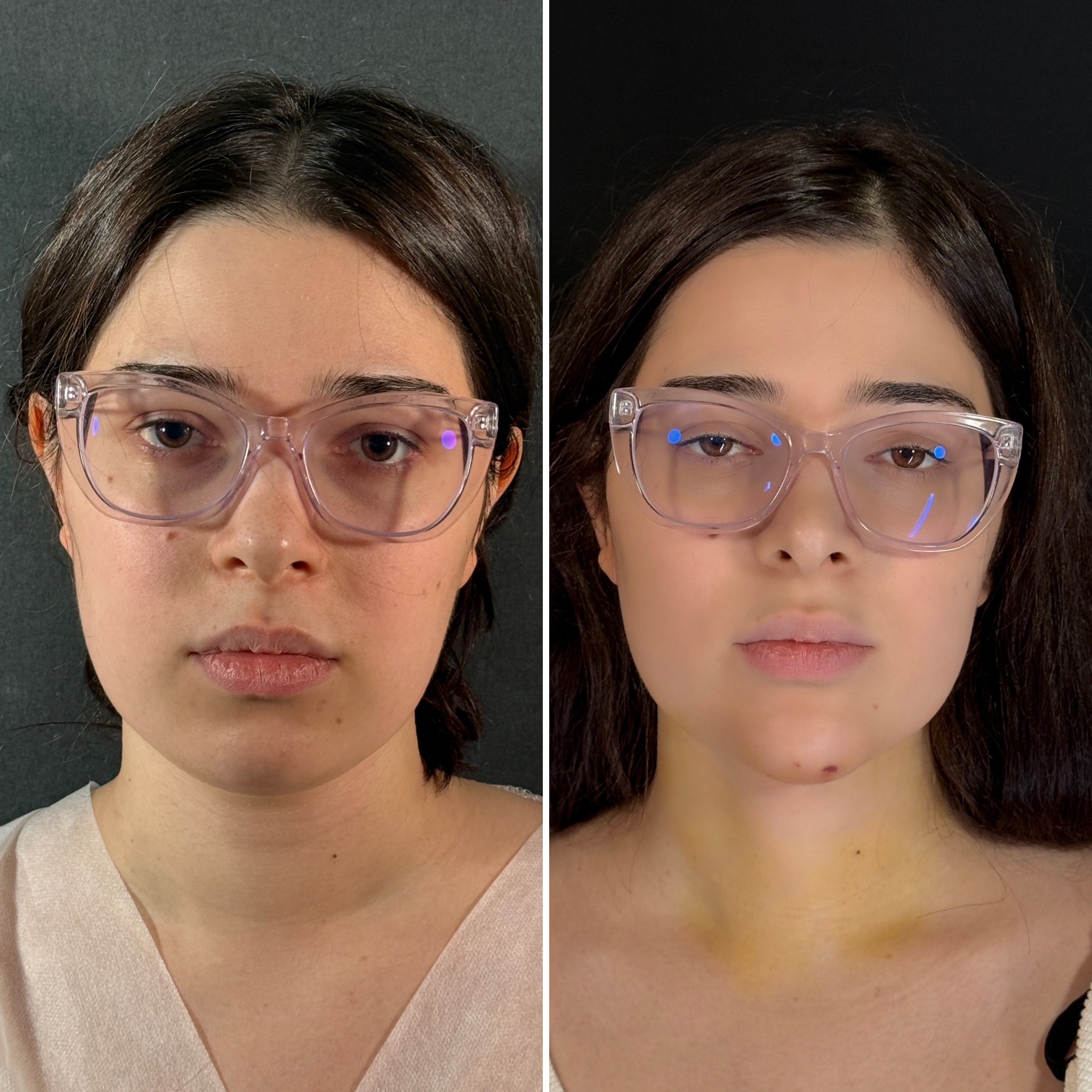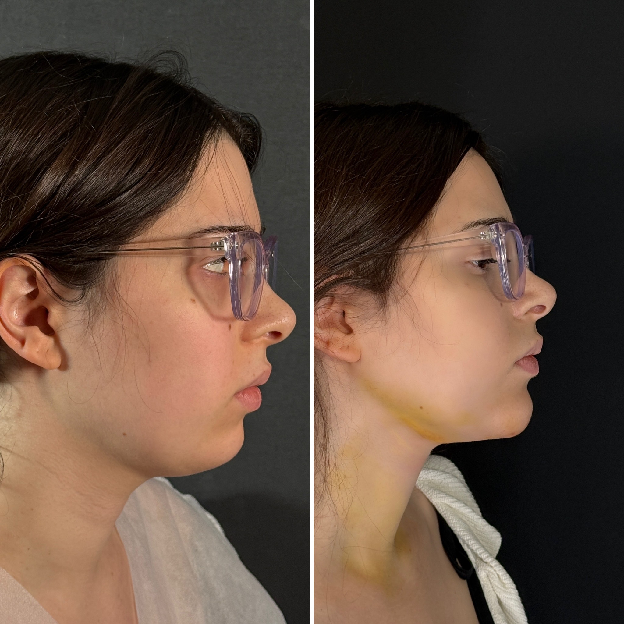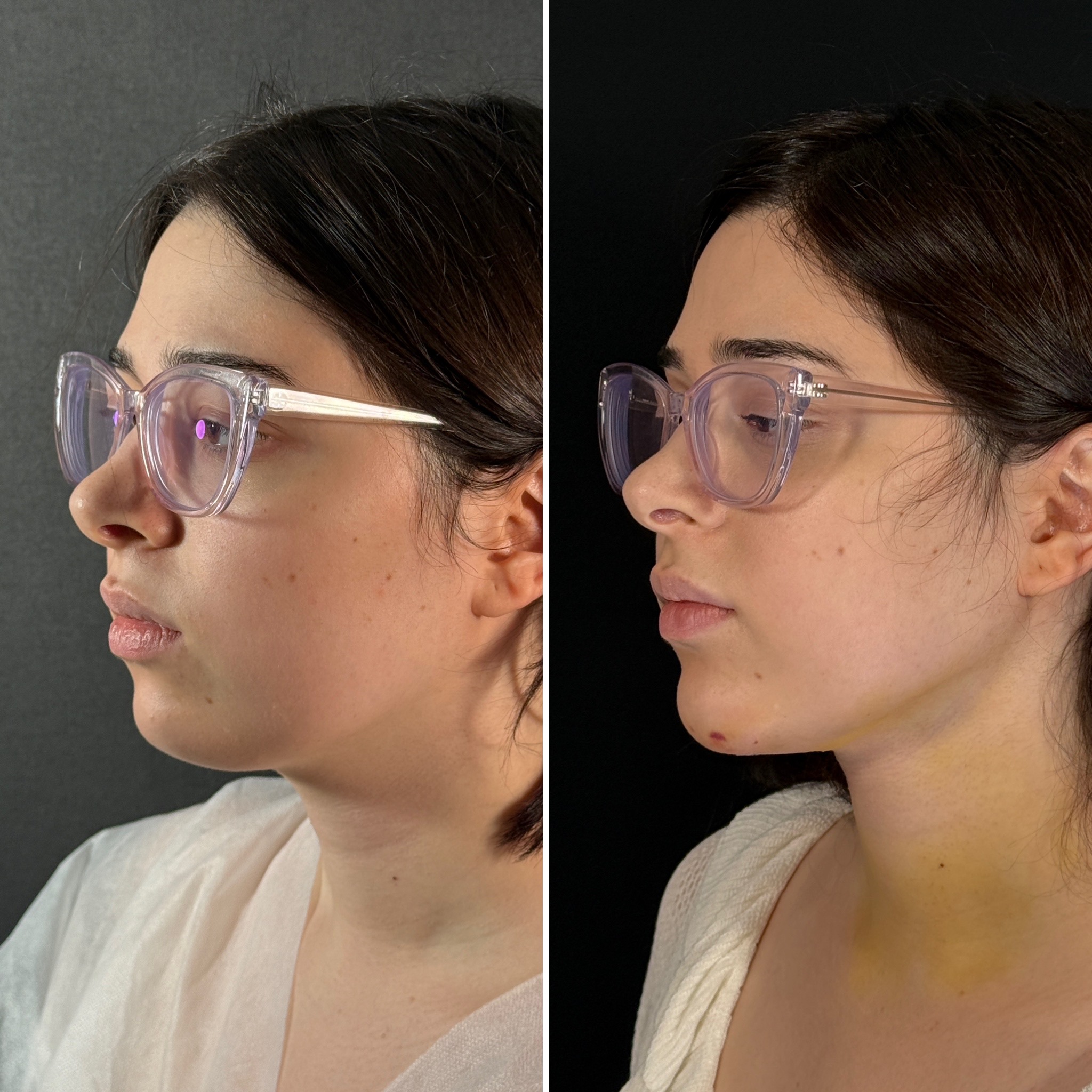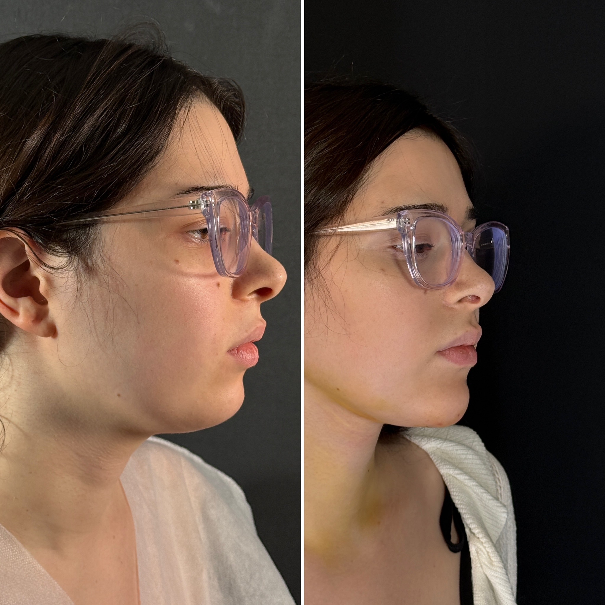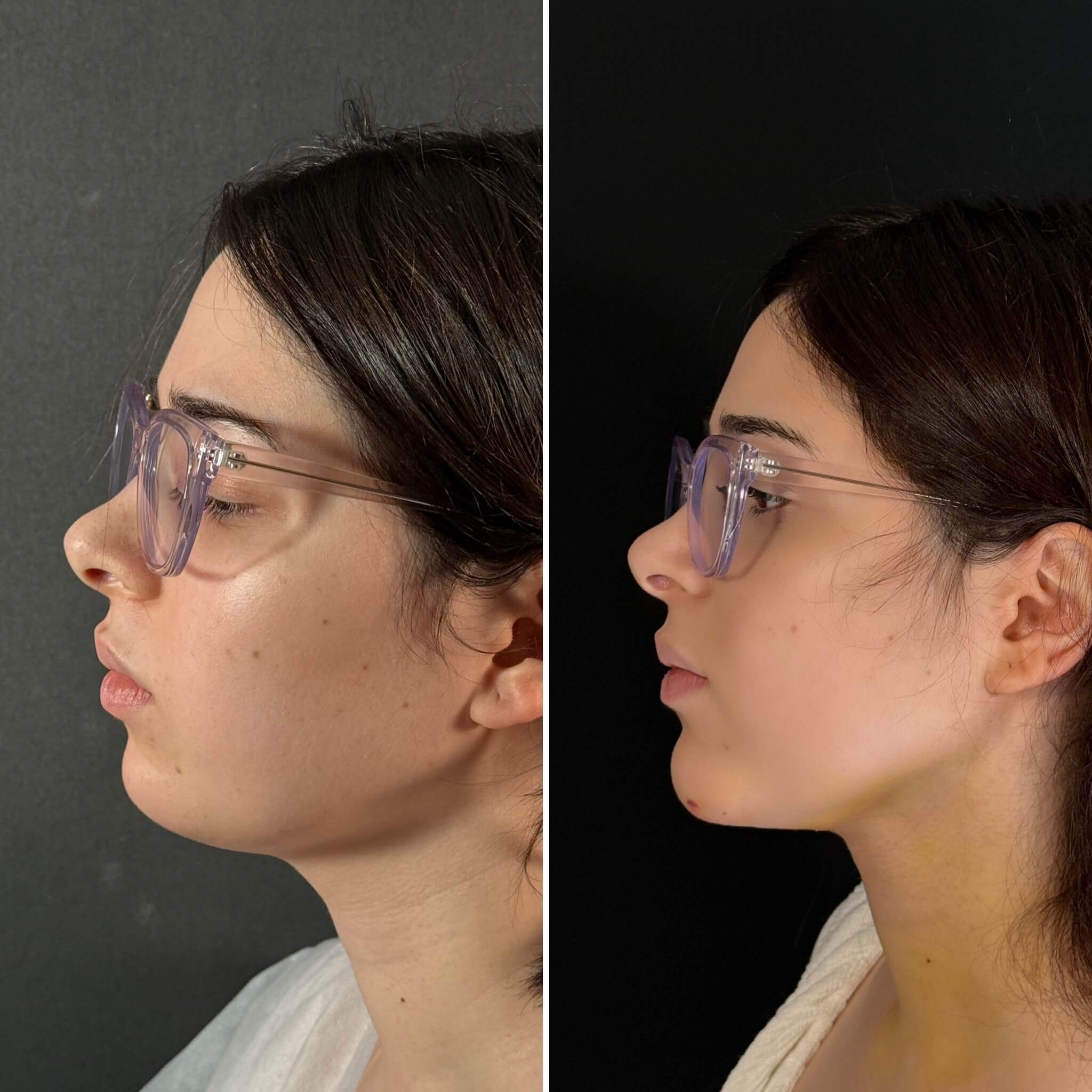 Выполнена ультразвуковая липосакция нижней трети лица, подбородка и шеи. Липофилинг подбородка.