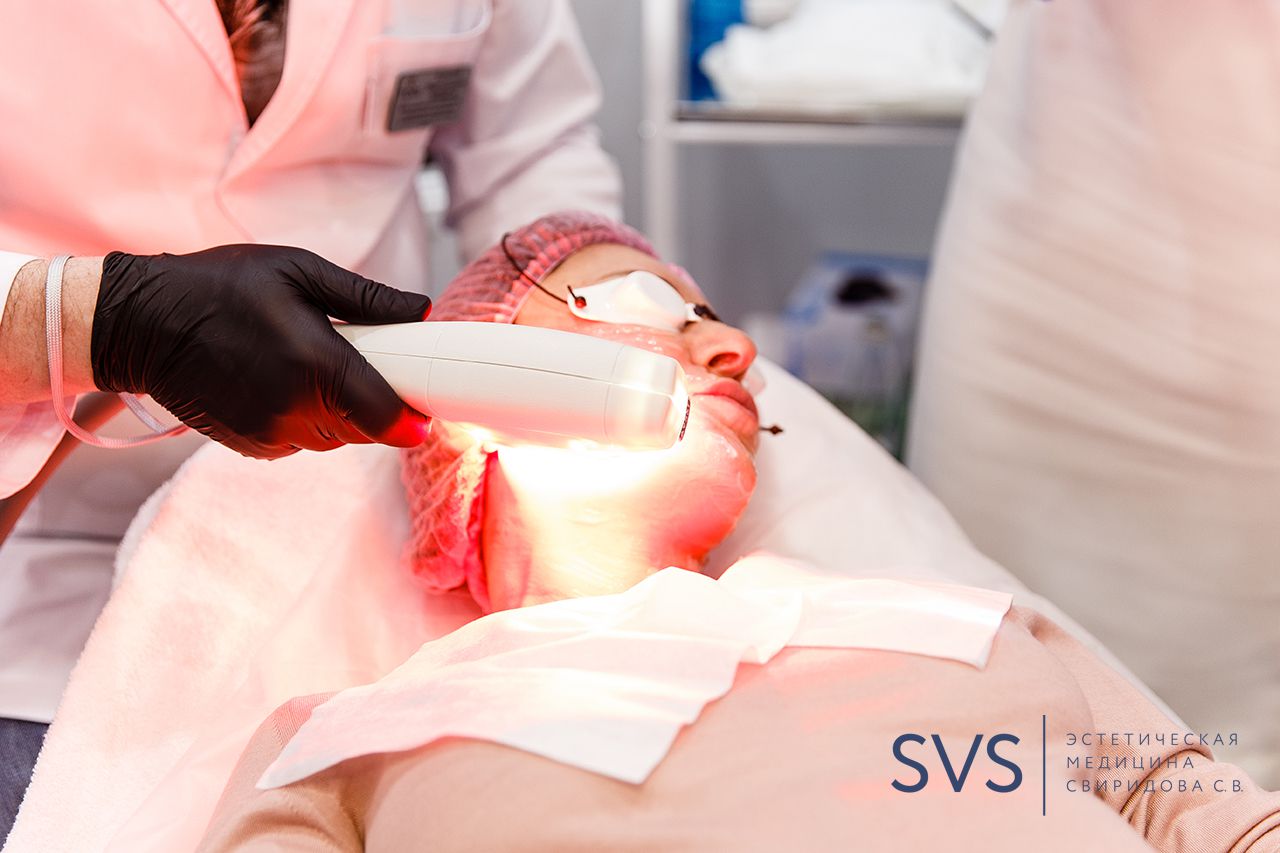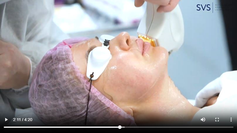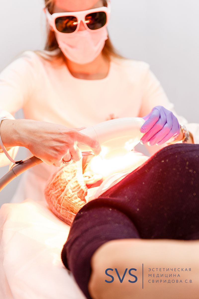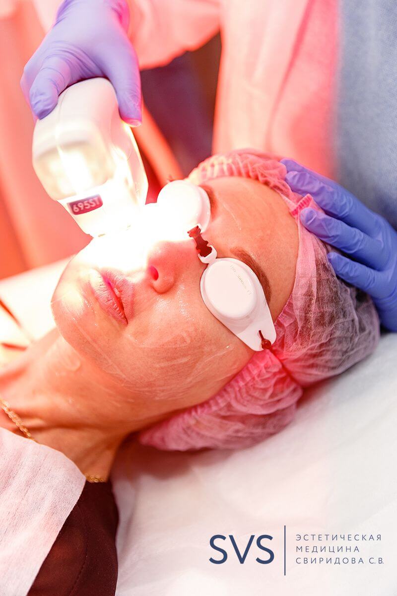Пациенту надеваются защитные очки и прижимая аппликатор к коже врач-косметолог направляет короткие световые импульсы на зону обработки.