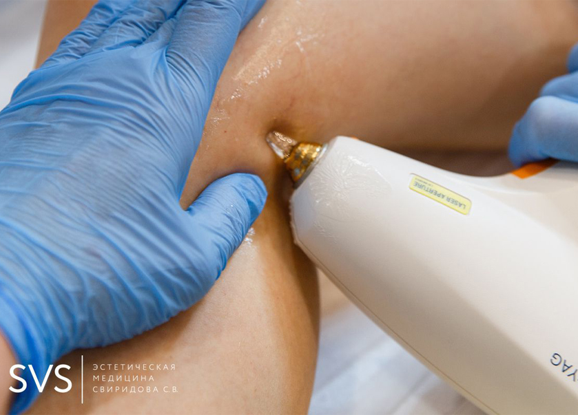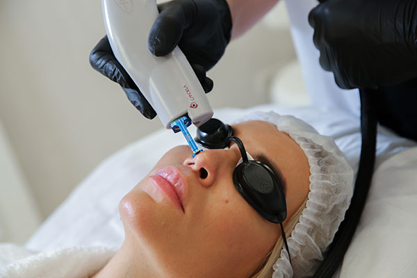 Врач очищает кожу от косметики, загрязнений и кожного жира, аппликатор лазера направляется на зону с сосудистыми дефектами, импульсы подаются точечно, каждый длится доли секунды — этого достаточно для коагуляции сосуда.