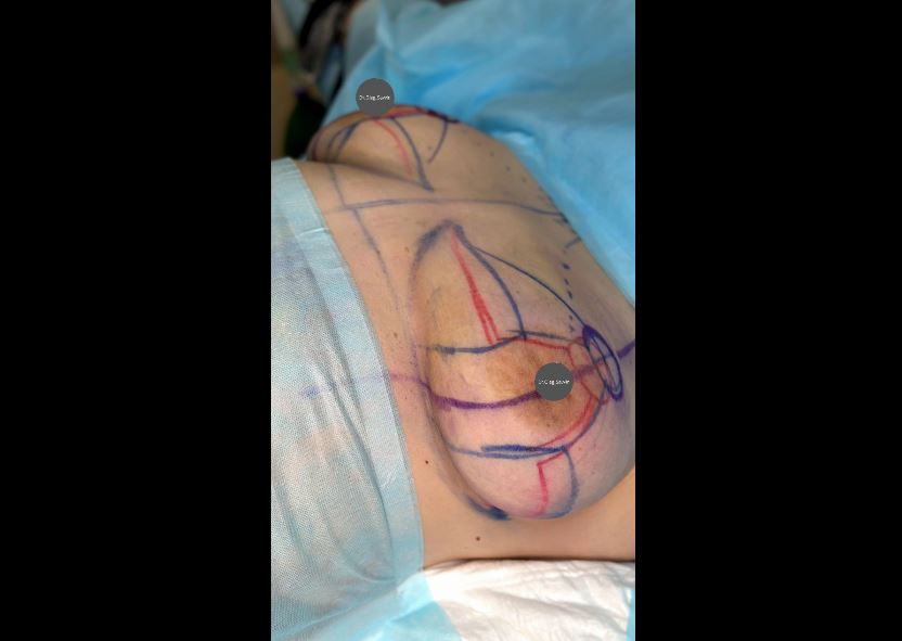 - В положении пациентки стоя маркируются линии будущих разрезов с учетом согласованных ранее формы, размера ареол, сосково-ареолярного комплекса.