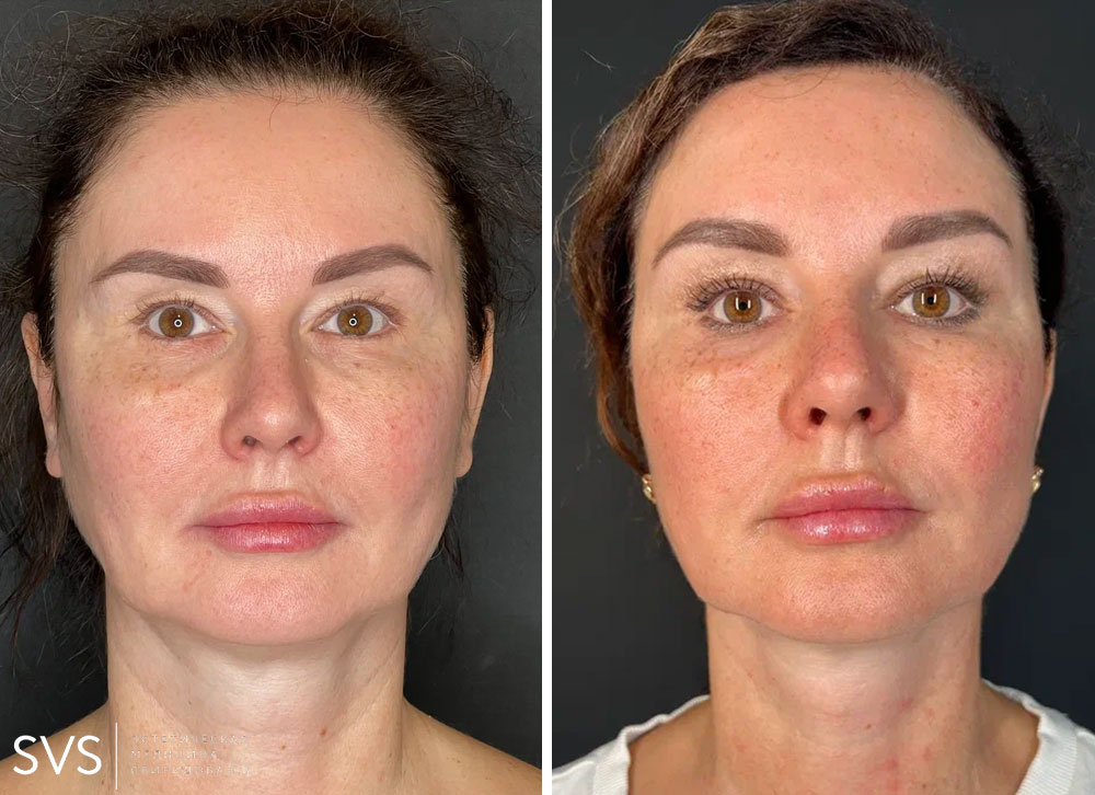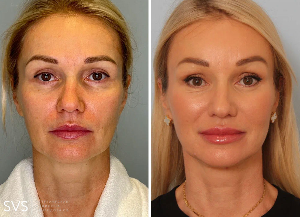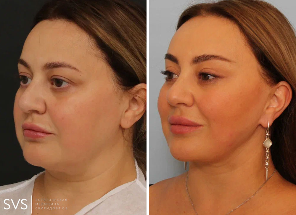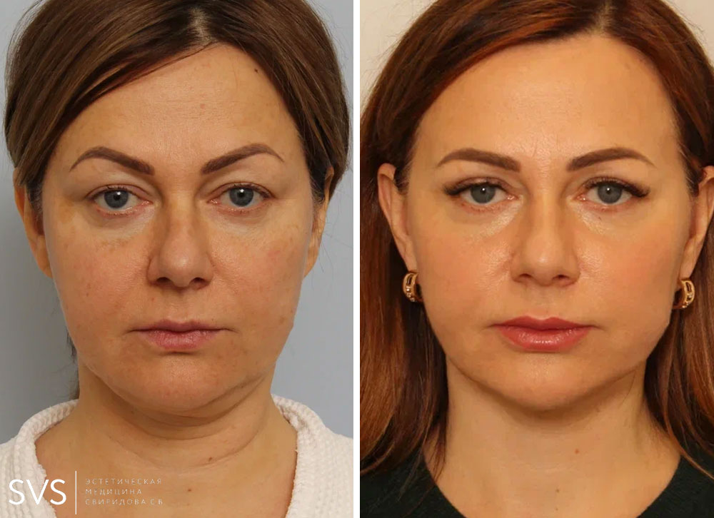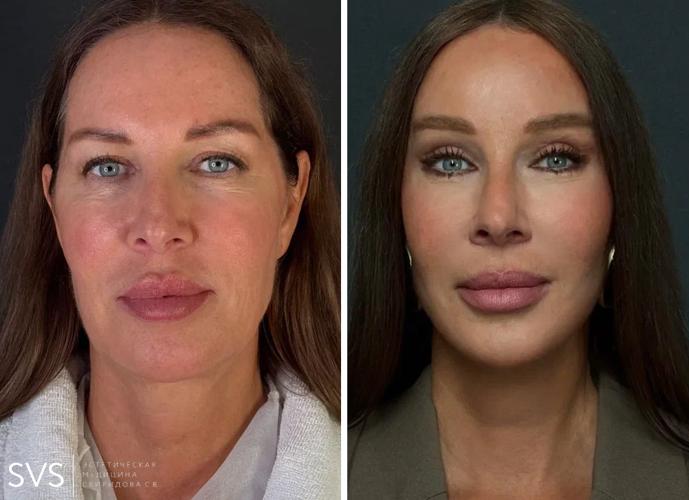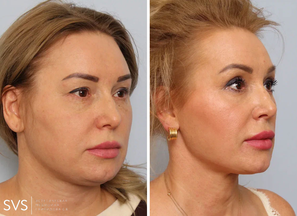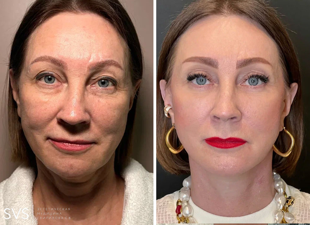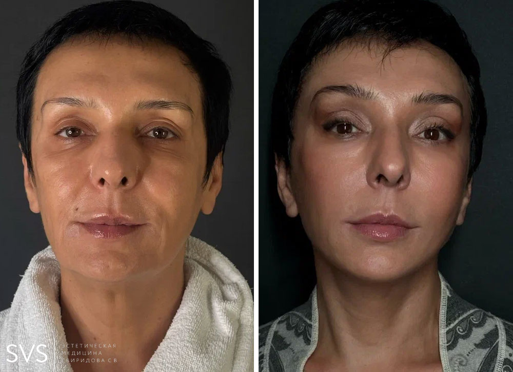 После коррекции контуры становятся более четкими, лицо выглядит подтянутым и гармоничным, а возрастные изменения — значительно менее заметными.